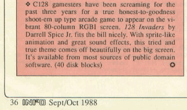 I found something I thought I'd never see again! In the late 80's I wrote one of the few games that used the Commodore 128's 80 column display. I even got mention in the 5th Anniversary Issue of INFO, which also happened to be the first issue of INFO I'd ever seen!(I had just moved to Houston, which has better bookstores than back home!). As you can see, I've had my SpiceWare logo for quite some time :-)