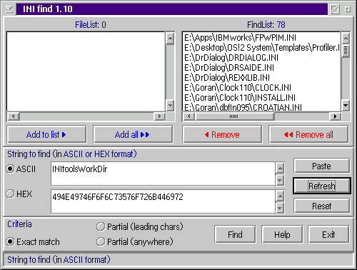 - You can find particular string in selected OS/2 INI file(s). Result can be written to file. Found Value in multiple files can be changed to new Value.