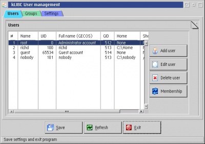 The users are: root, guest, nobody, and a real user such as yourself. The users are created with a tool named: kLIBC User Management. It will appear after Samba is installed in the Programs group. Look in the Programs and you will see: bitwiseworks Apps and Ports
