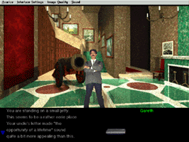 Uns begegneten nur vier Charaktere in unserer kurzen Testzeit. Einer von ihnen ist ein mysteriöser Butler, die anderen drei erhielten genau wie sie eine Nachricht von ihrem Onkel. Die Charaktere sehen wie digitale Photographien von realen Personen in Kostümen aus, aber jede hat nur eine Pose. Sobald sie mit ihnen reden, wird ihnen eine Liste mit Fragen präsentiert. Wird eine Frage gestellt, so wird diese durch die nächste logische Frage ersetzt, die anderen Fragen sind immer noch verfügbar. Der Charakter gab einige Informationen, verließ uns aber mit der Frage "Ja. Na und?". Eine Empfehlung würden wir gerne den Schöpfern des Spiels machen, nämlich die Wahl aller Fragen auf der Basis der ersten Frage durchzuführen. Dem Spiel wird ein Teil des Glücksgefühls entzogen, wenn man weiß, daß man alle vordefinierten Fragen auch in einer Begegnung beantworten lassen kann. Wir finden auch, daß der Spieler von den Charakteren befragt werden sollte und auf deren Fragen antworten können sollte, damit das Gefühl der Interaktion vergrößert wird. Wenn wir eine Wunschliste aufstellen könnten, dann würden wir darauf den Wunsch nach einer Sprachausgabe für die Charaktere setzen. Es gibt dem Spiel mehr Realismus. Punkt zwei auf der Wunschliste wäre, daß die Charaktere tatsächlich in irgendeiner Form als Video realisiert werden. Körpersprache und Gesichtsausdruck würde dem Spiel und dem interaktiven Gefühl guttun.