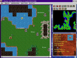 Nachdem das Spiel geladen ist, müssen sie ein neues Spiel anfangen. Die erste Frage, die ihnen gestellt wird, ist, ob das Spiel auf einem Einzelrechner oder einem Netzwerkrechner gespielt wird. Ich wählte Einzelrechner an, da ich nicht mit einem Netzwerk verbunden war. Sie werden dann nach der gewünschten Anzahl von Gegnern gefragt, gegen die sie gerne spielen würden (1 oder 2). Das Spiel hat vier Stufen des künstlichen Computergegners (von Anfänger bis fortgeschrittener). Da ich mit dem Spiel noch nicht vertraut war, wählte ich einen Gegner auf der Anfängerstufe. Nachdem sie den Gegner ausgewählt haben, haben sie die Möglichkeit, ihr Imperium, den Regenten und den Namen der Hauptstadt auszuwählen. Das Spiel liefert ihnen auch Vorgaben, aber sie können sie ändern. Ich schlage vor, daß sie sich eigene Namen für ihr Imperium, den Regenten und die Hauptstadt aussuchen (obwohl die Vorgaben nicht schlecht sind). Danach werden sie auf die Welt transportiert, um mit ihrem Feldzug zu beginnen.