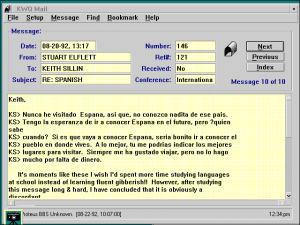 Currently, there are 3 known QWK compatible readers for OS/2, I've seen only two of them (I've included a GIF file showing you what one looks like.) - Mail Reader/2-MR2 (Text Based) and KWQ (PM Based apps. CUA)