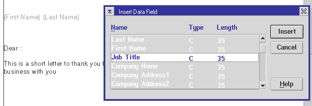 Fügen sie ihre Serienbrieffelder ein. Plazieren sie ihren Cursor an der Stelle, an der sie das erste Serienbrieffeld einfügen möchten und wählen sie Datenfeld einfügen aus dem Editieren Menü. Eine Dialogbox erscheint, die alle Felder der PIM Kontaktliste auflistet. Indem sie auf einen der Feldnamen klicken, werden die Felder an der derzeitigen Cursorposition in ihr IBM Works Dokument eingefügt. Sie werden feststellen, daß sie weitertippen können, während die Dialogbox über ihrem Dokument schwebt, bis sie das Dokument schließen. Das macht es ihnen bei mehreren Feldern, wie bspw. Adressen, leicht, die notwendigen Abstände oder Leerzeilen einzufügen.
