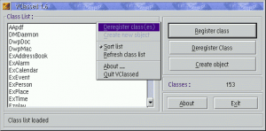 VClassed is a small and esay to use tool created to maintain and manage WPS classes installed on your system, it can : list, add, remove and use installed wps classes. To do this it offers an easy to use PM interface which allow you to do everything just clicking here and there.